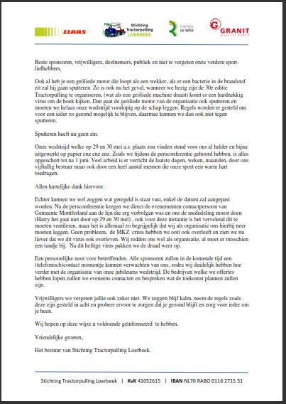 In verband met het feit er geen evenementen voor 1 juni 2020 mogen plaatsvinden is de kalender voor Tractorpulling aangepast.